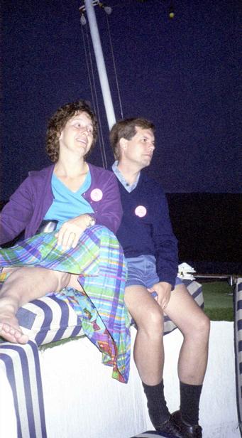 After dinner we danced a while. At first the ship was tossing, and the contra and English dances I did were very messy. Then it settled down and we had some very nice dances. I went to the bow late, overhearing that Mary Lea had seen dolphins. I didn't, but the bioluminescence was amazing. Maybe sometime I will. I lost the patch Judy gave me, and got a new one from Mary Lynn Dobson. I started using a half-patch. |