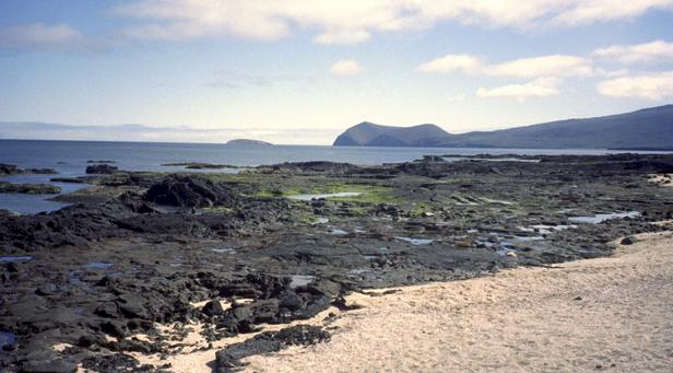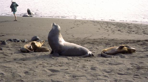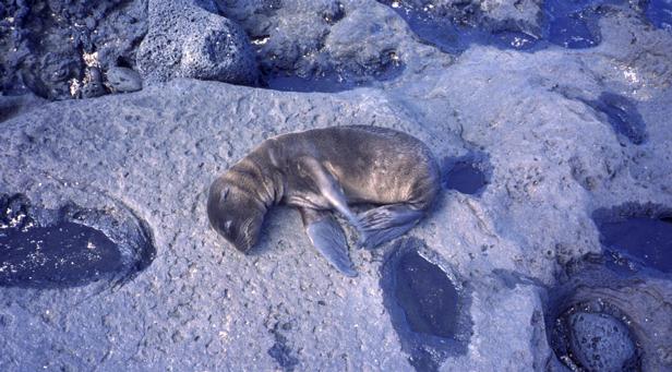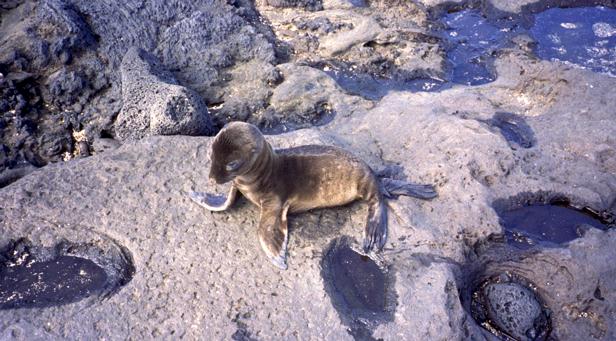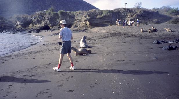 9/20/2001 We went to James Cove (P. Egas) on Santiago in the morning. There were both California and fur sea lions. We snorkeled. I saw a good-sized ray, and swam for a while with a sea lion. The sea urchins were beautiful -- some chartreuse, others looked black from a distance, but showed purple, blue, and green up close. Some interesting angels and some parrots. Parrot fish colors were subdued, mostly. Played cards after lunch. It was a new game to me -- don't know a name. |