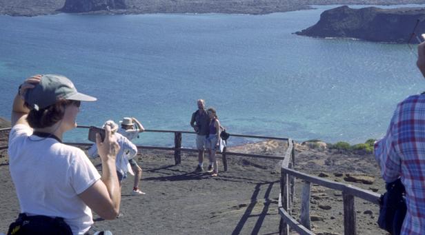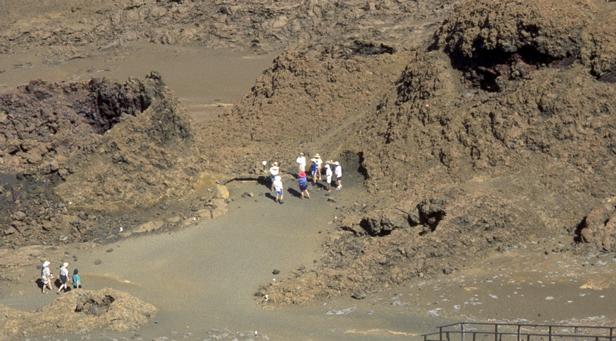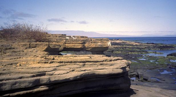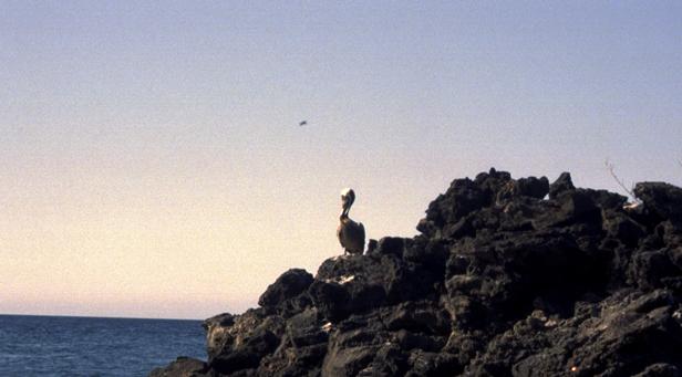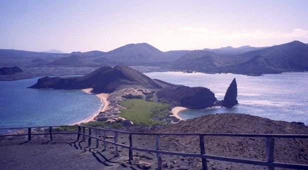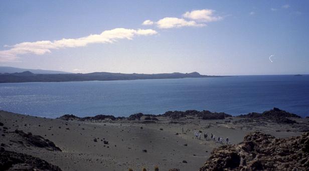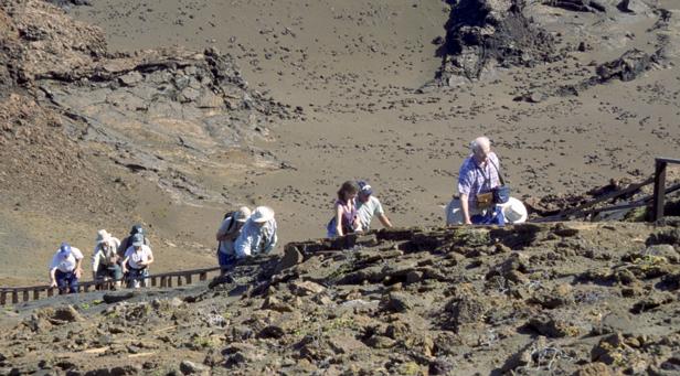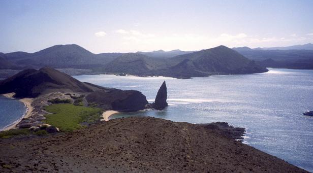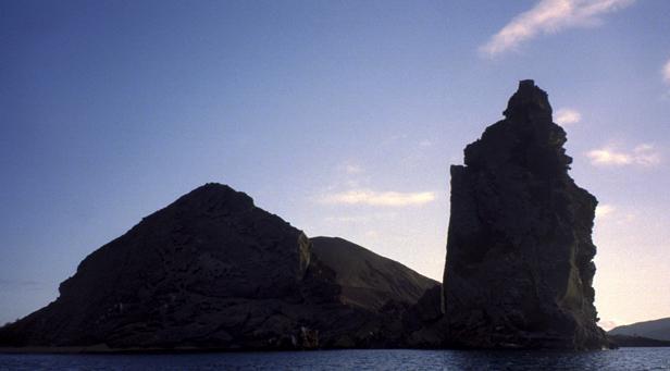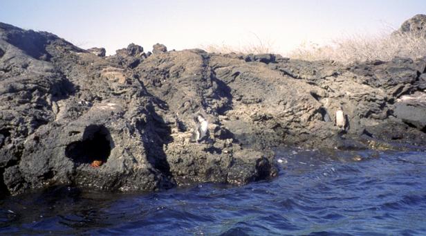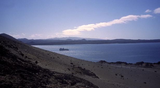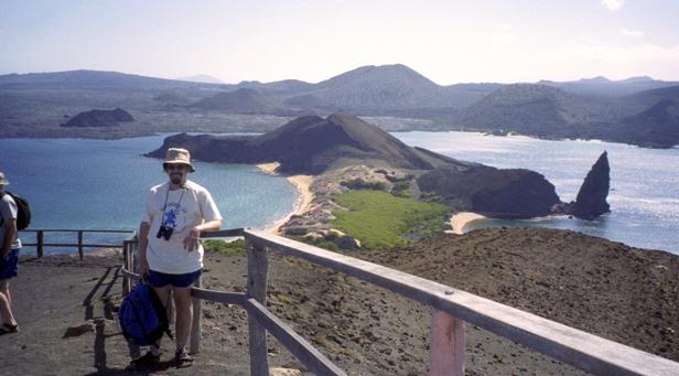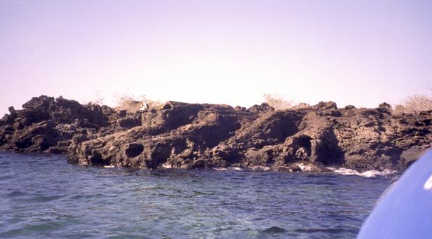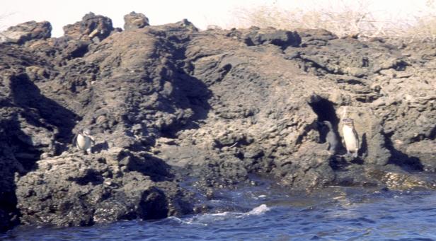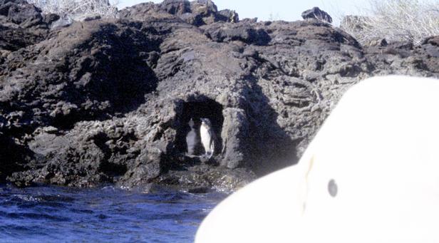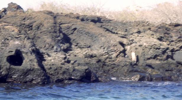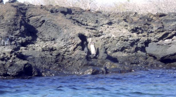 Second trip was to a very small island around Santiago called Bartolome. We climbed to the top an old lava cone for a beautiful view of the bay with two beaches and Pinnacle Rock below. Afterward, we took the pangas around to one of the beaches. I managed to leave my Akona sandles on the dock. From the beach, snorkeling was in turbid water, but the sea life was awesome. I saw a white-tipped shark and a good-sized eagle ray, a smallish but bright trumpet fish, and some huge starfish. Also a big sea cucumber. On shore very near, I saw more sea lions, blue-footed boobies, and Galapagos penguins. Great dive! That evening after dinner, I should have gone to bed early, but stayed up and played Scrabble© instead. |
