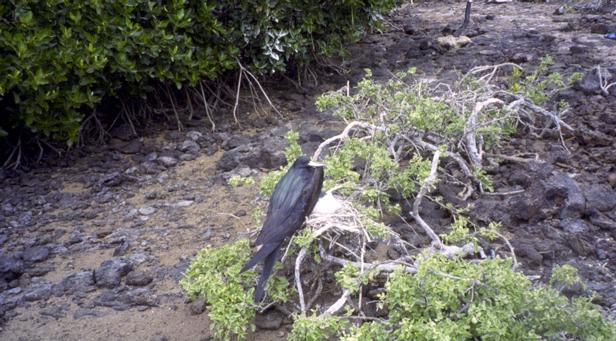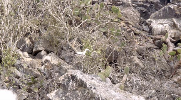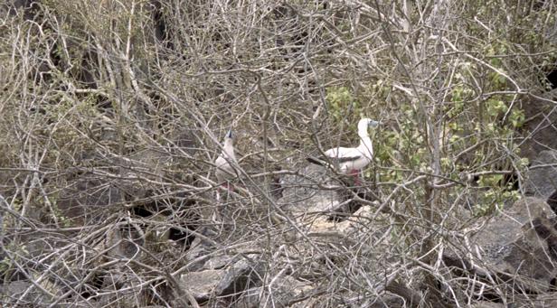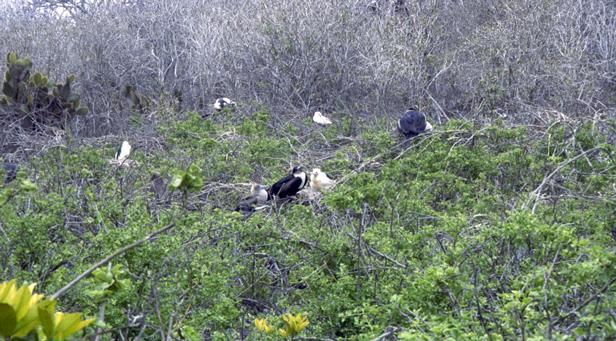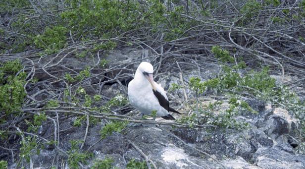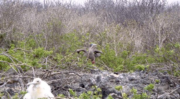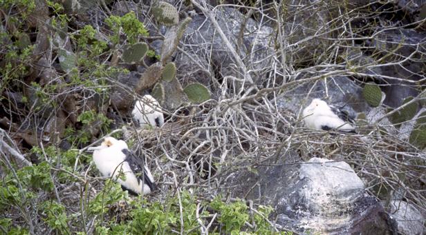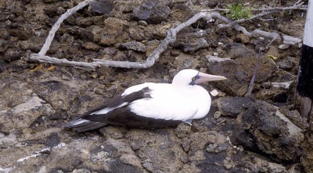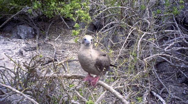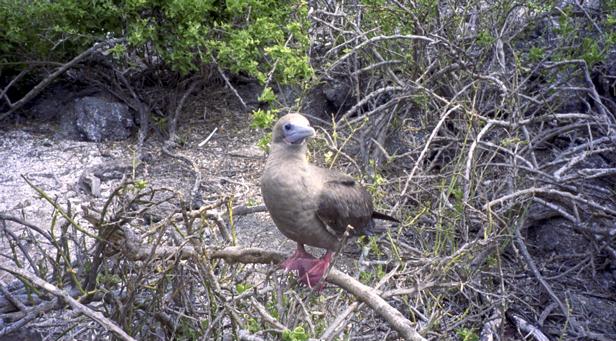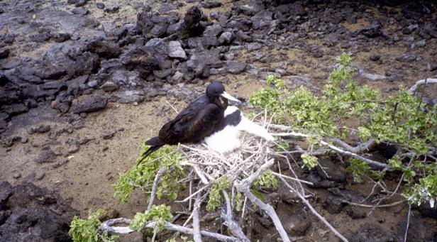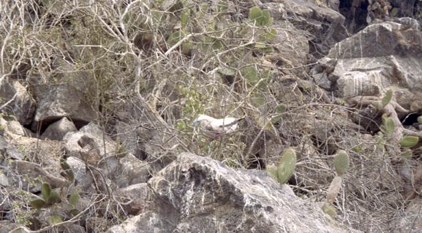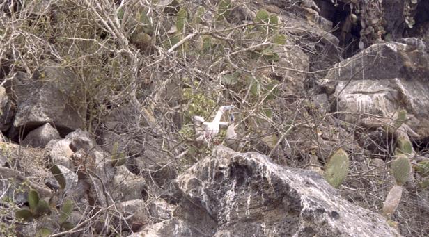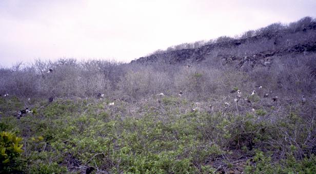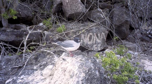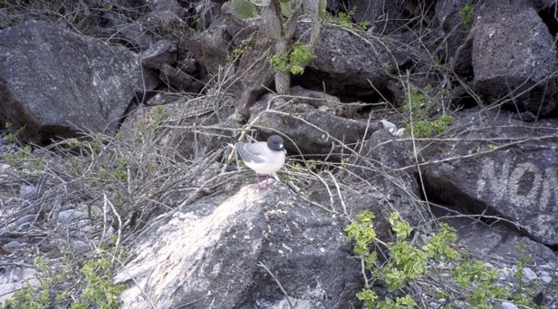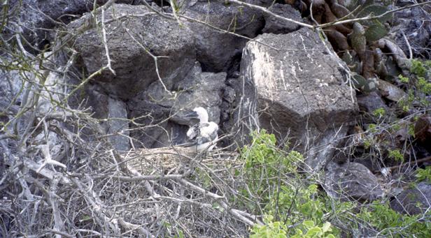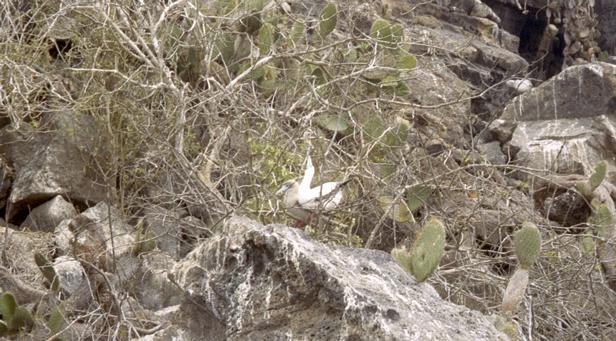 9/21/2001 During the night we motored to Tower (Genovesa), into Darwin Bay. this whole island is really just a bay, being a collapsed caldera. A horseshoe shape with imposing cliffs almost all around. In the morning we went to a beach which was coverfed with swallowtailed gulls, red-footed boobies, frigate birds, and some masked boobies. Many had young in their nests. Neat to be so close. snorkeling was clear, though current was a bit rough. saw a large (3'?) trumpet fish in green. Lots of parrots and triggers. |